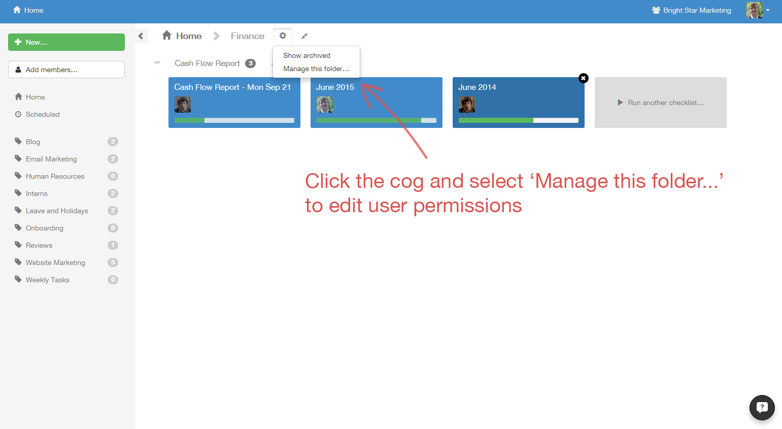 Users have individual permissions for each folder. To edit permissions for a user, first go to the folder you want to give or restrict access to and click the cog, as shown below.
