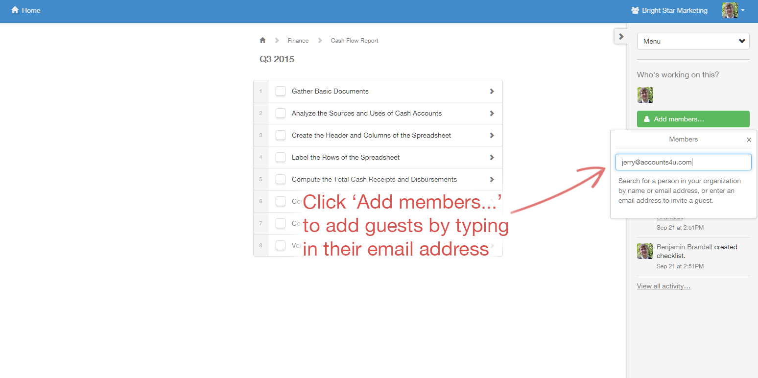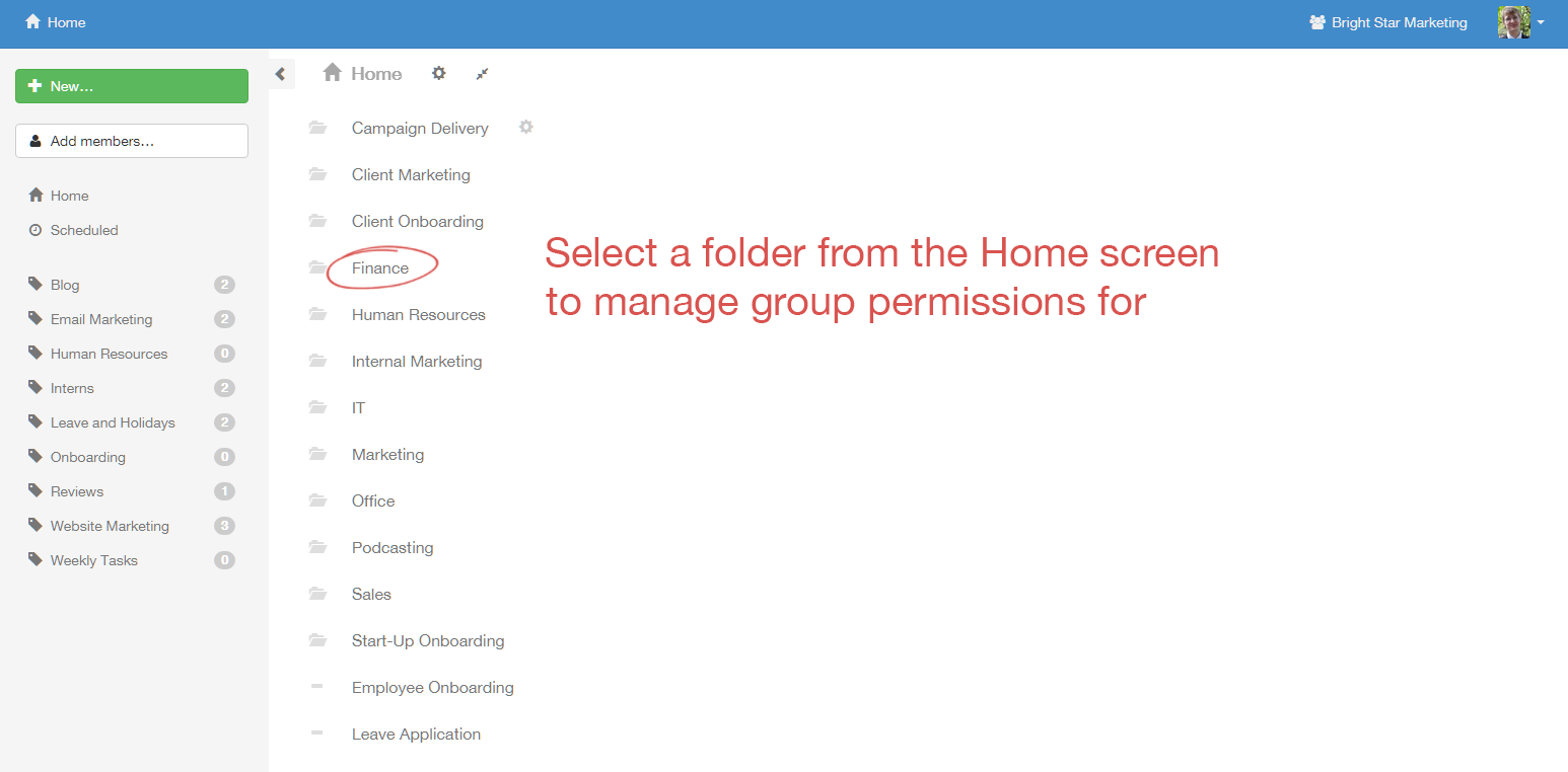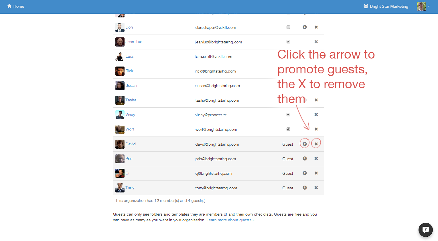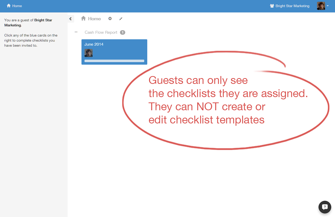 Members, by default, have access only to templates and checklists in the Home folder — the one you'll go to by clicking Home in the top right corner of your screen. Members must be given access to templates, folders and checklists on an individual basis with permissions that we'll explore further down the task. To add users to individual checklists or templates without giving them control over anything, you must assign them as guests.
