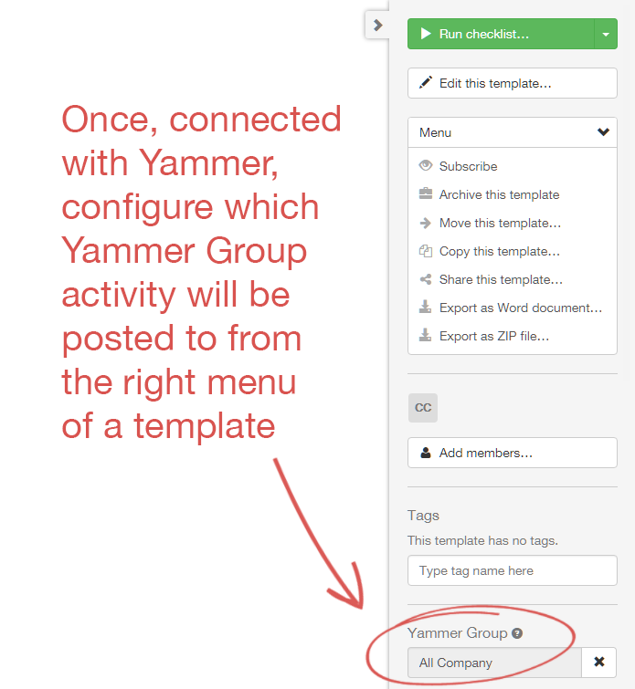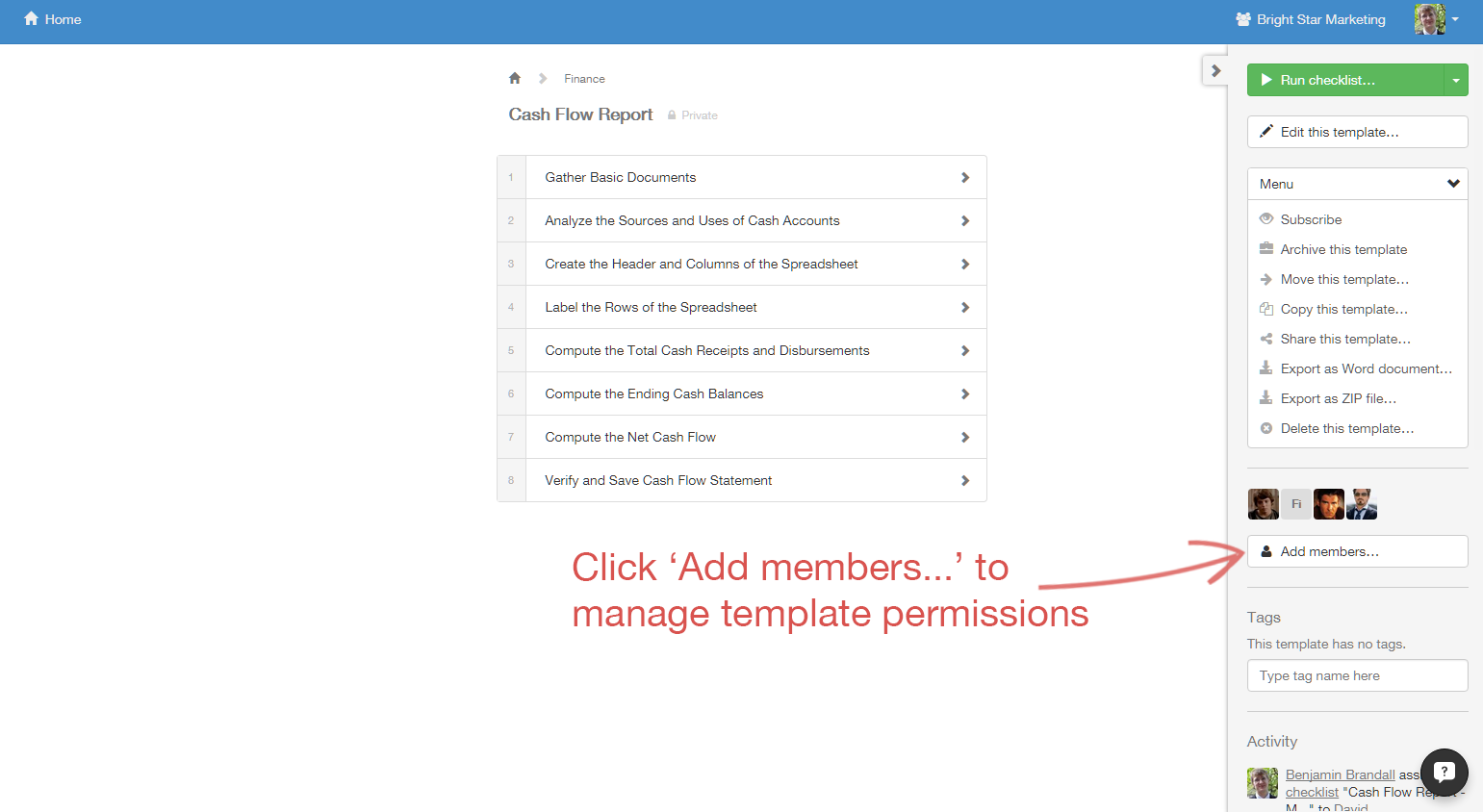 Managing permissions on individual checklists is done by clicking 'Add members...' from the right menu of the checklist you want to manage.