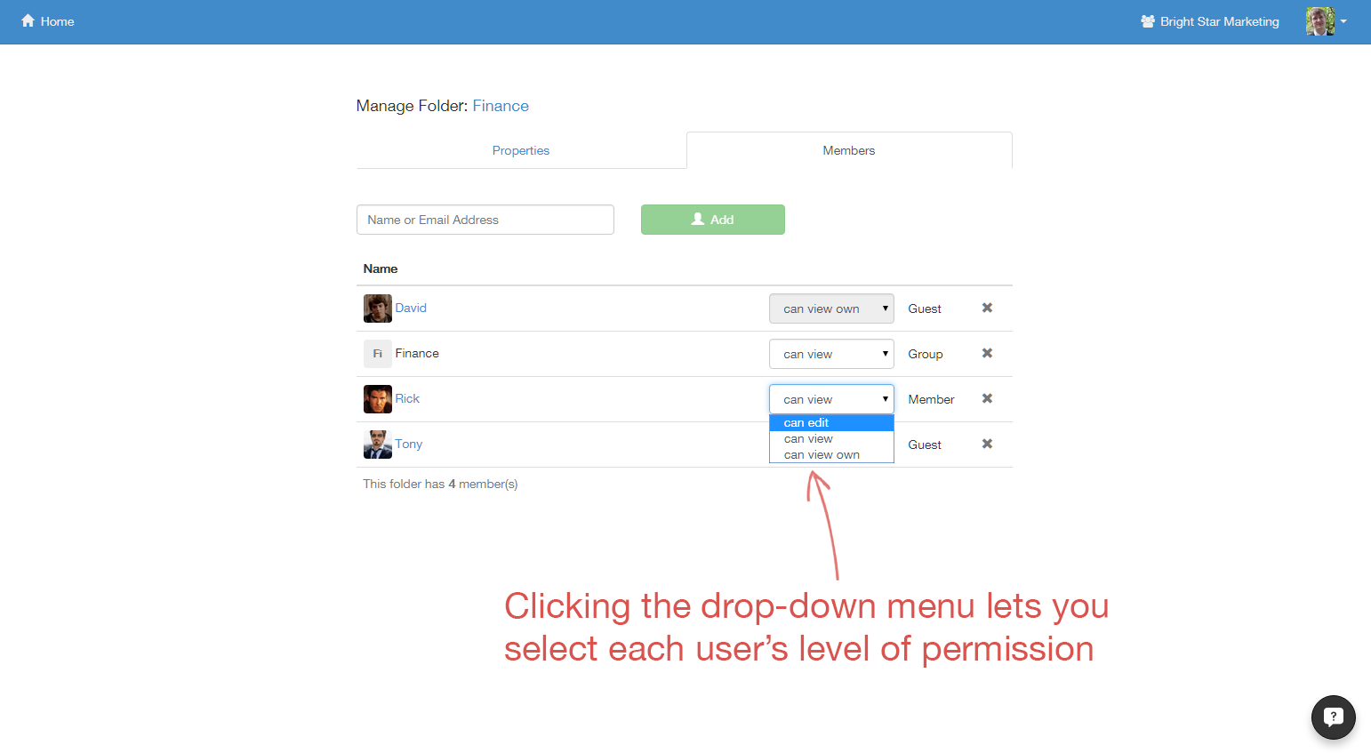 On top of the member and admin options, you can also specify how users can interact with certain folders and templates.