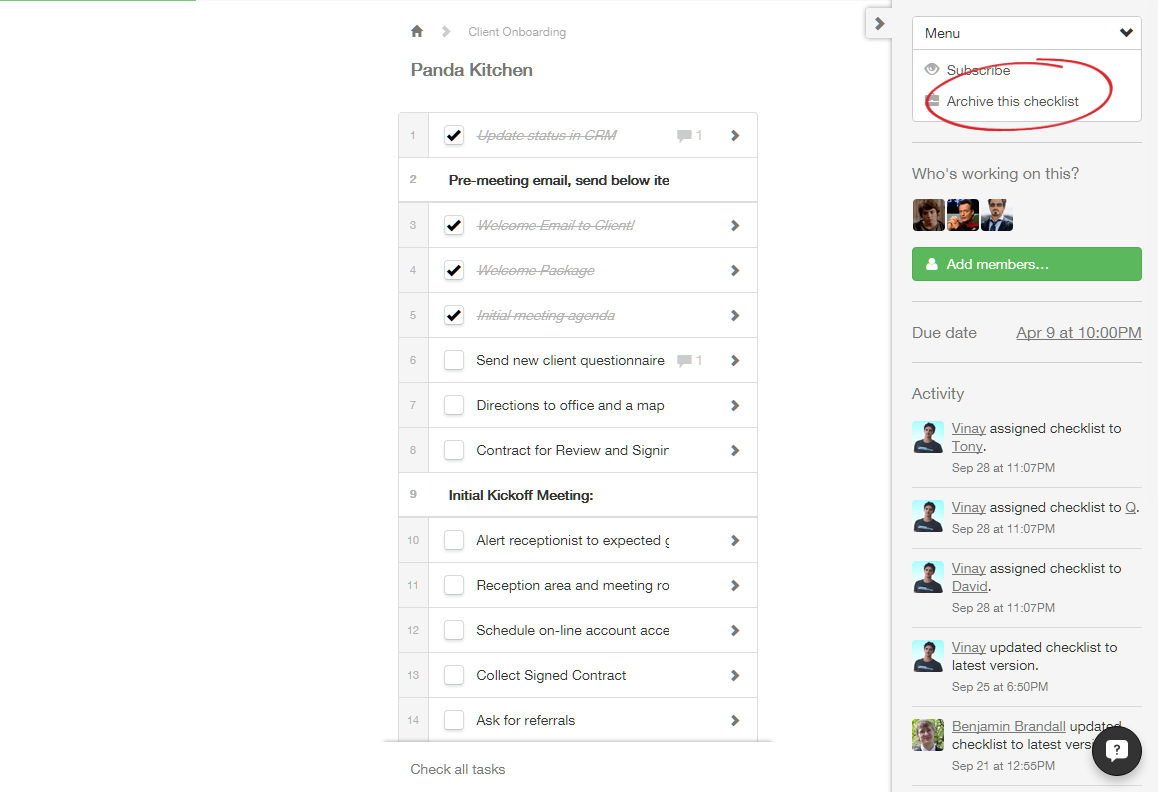 - Check tasks on all checklists