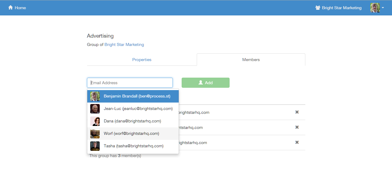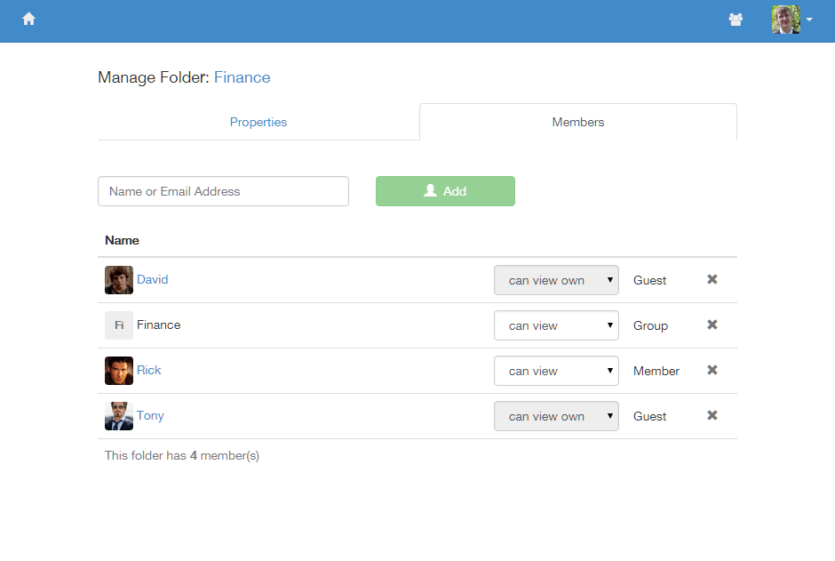 Once inside, you can add members and groups. It works in the exact same way as managing folder permissions.