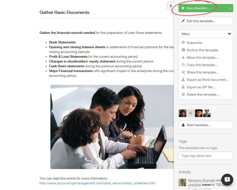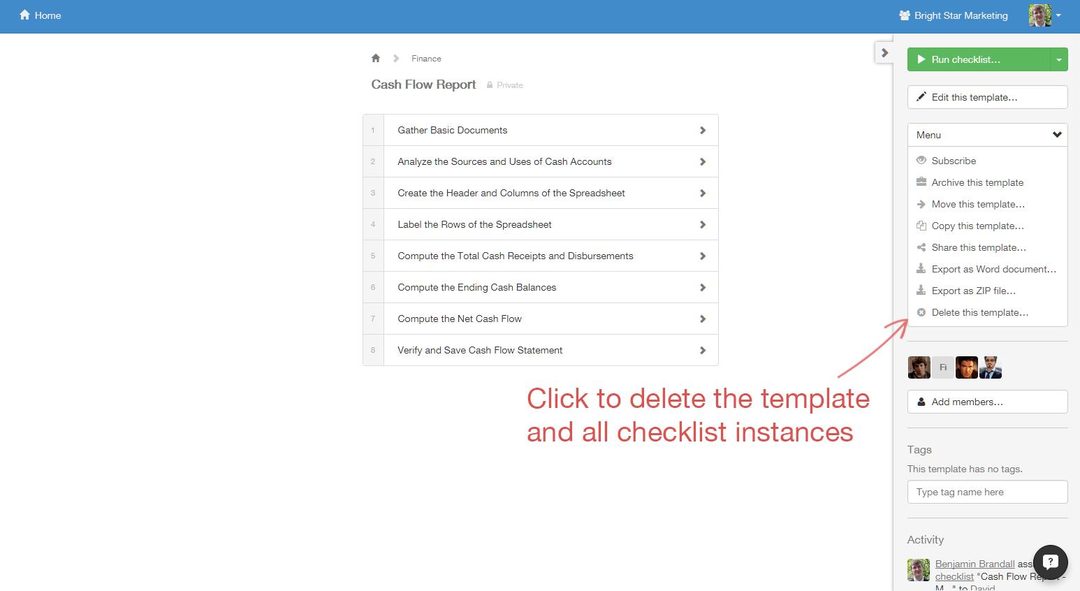 When a user is added to a template with 'Can edit' or 'Can view', they inherit the permission to view its checklists. To see who has inherited permission to a checklist, click on it and then go to 'View all activity'.