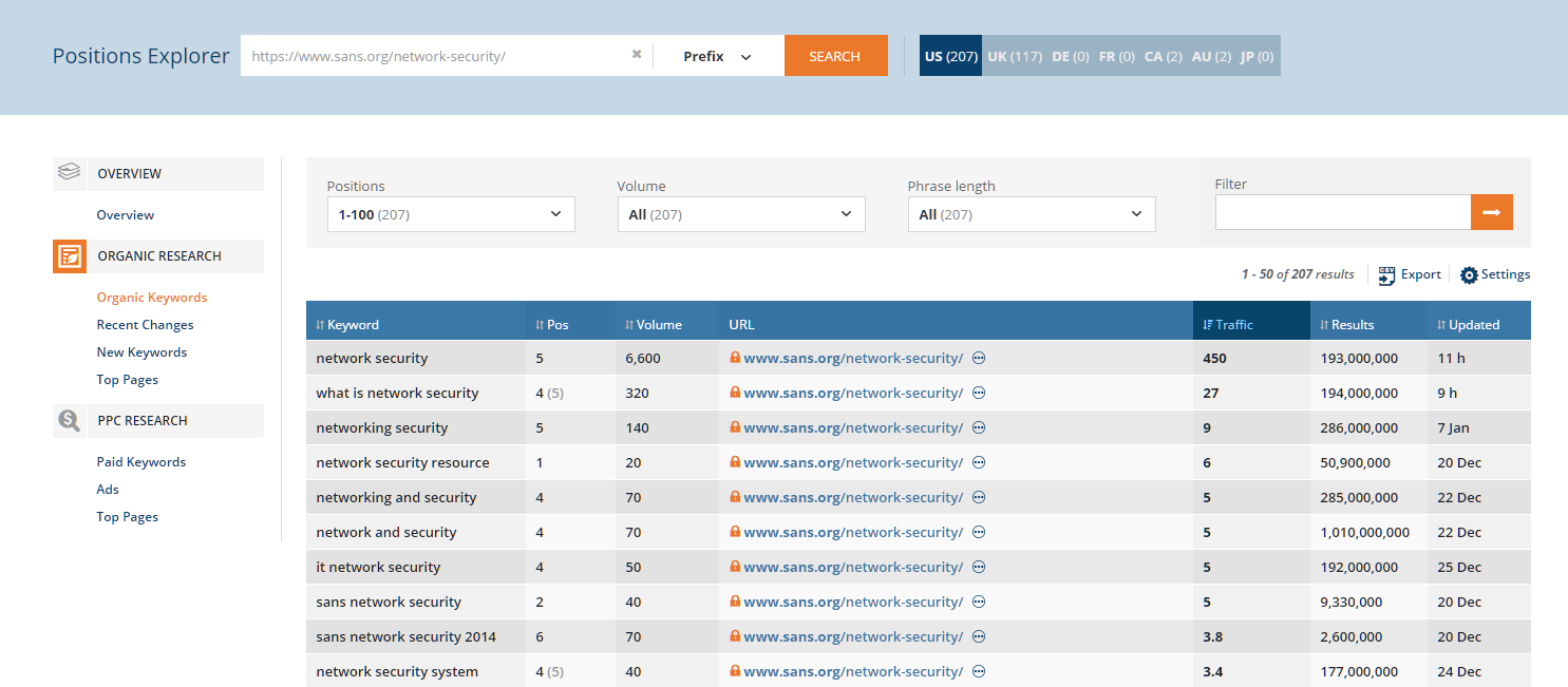 Using the same competitors as in the task above, search a competitor's URL in Positions Explorer to get a list of keywords like this: