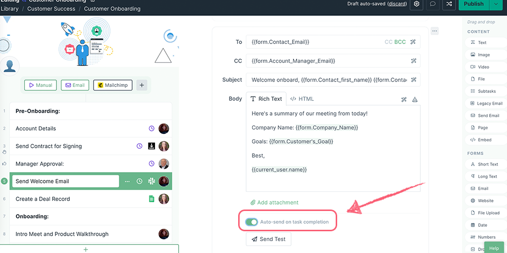 If you have a send email widget in your task, you can automatically send out your email when you complete this task.