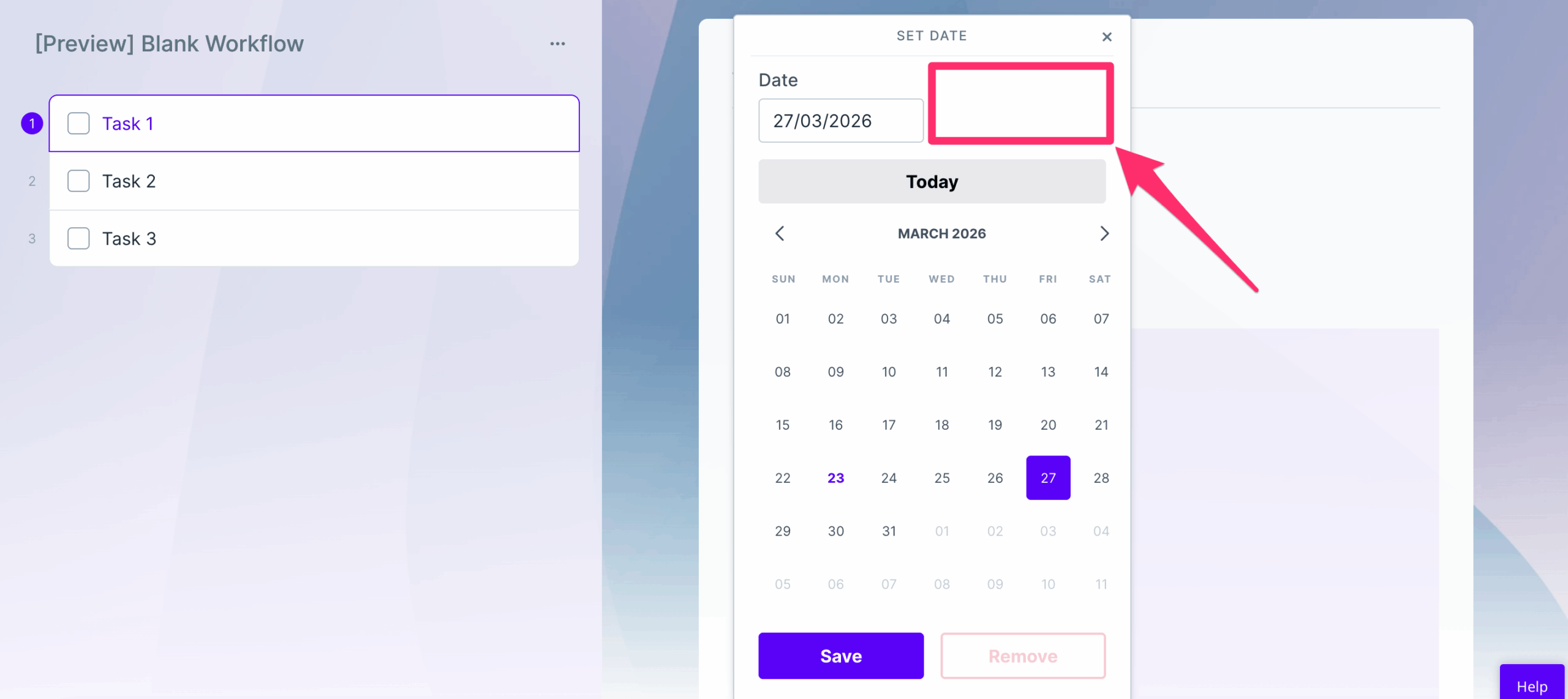 Once you’ve added the field in the workflow editor, hover over it and you’ll see a three-dot menu in the top-right corner of the field. Click here and select Settings to open the validation settings. Click Add rule to set whether the due date should be before or after a specific date or a dynamic date from the workflow. Click Save to save the validation settings.