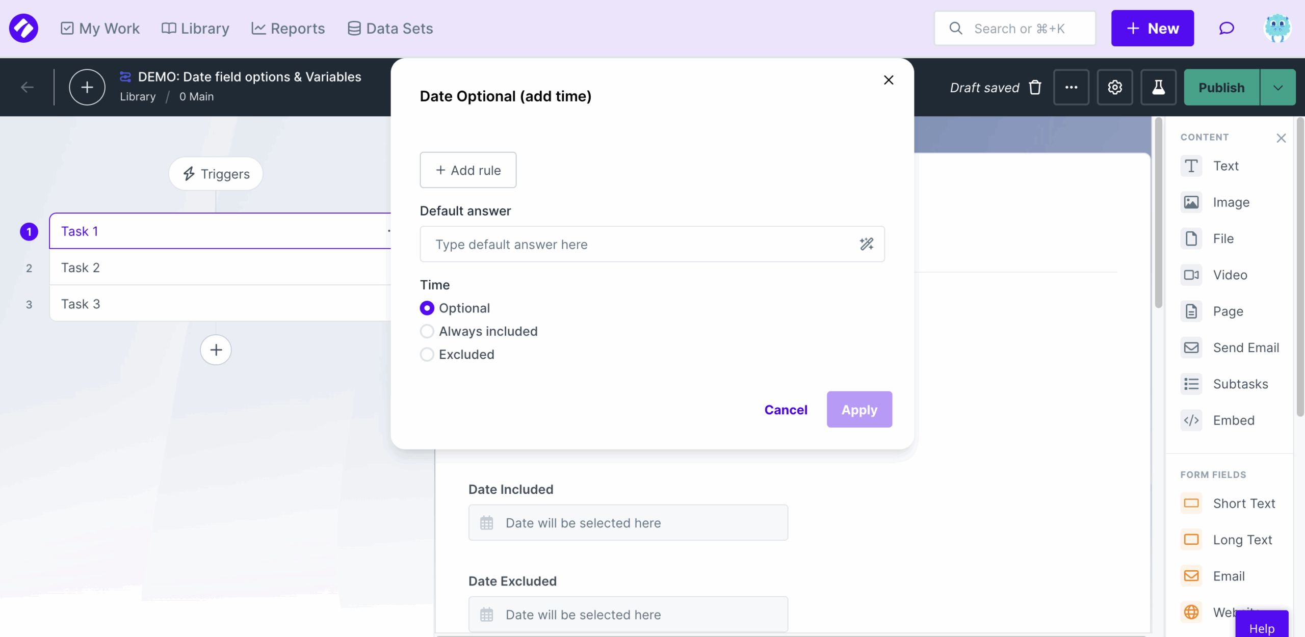 Selecting Excluded will not show the time option while on the date picker. The user will not have the option to add time. When the date field variable is used, it will reflect the date without time.