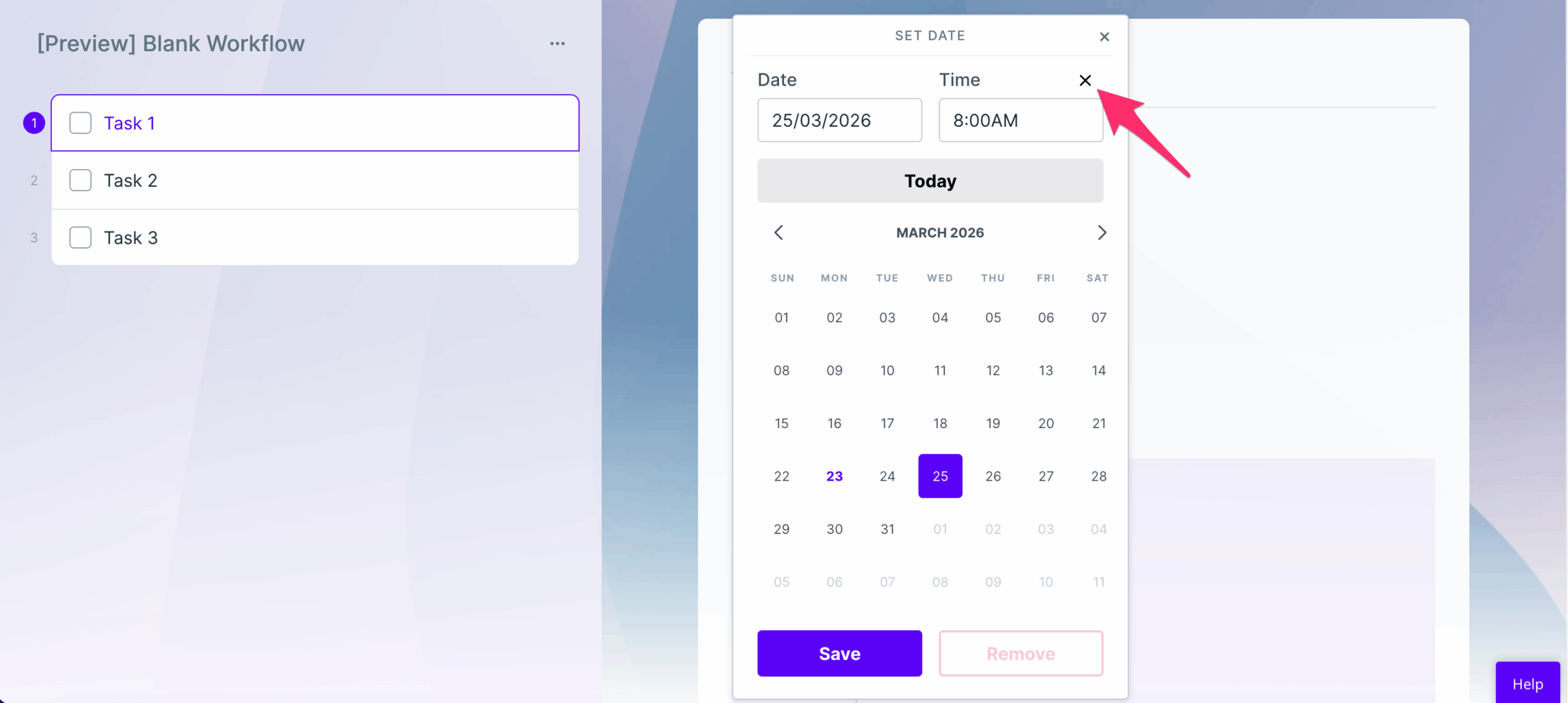 Date fields can be used in Conditional Logic and can be used to set Dynamic Due Dates. If you have a workflow run with a date form field in it, you can select a date (adding a time is optional).