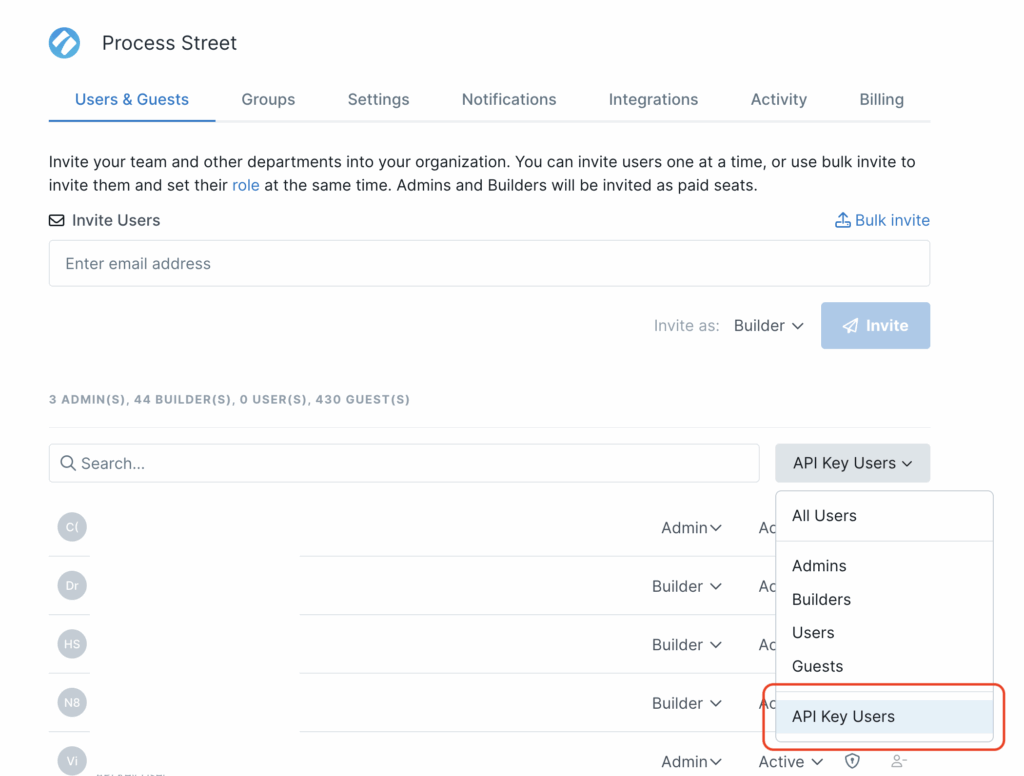 To view and manage your API key users, go to Users & Guests → API Key Users.