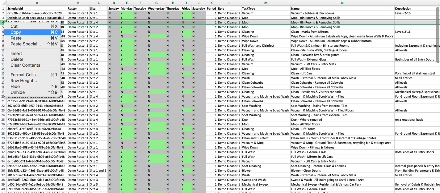1) Right click on the row you want to copy, be sure to click the number of the row on the far left hand side. In this case we've clicked row #4 2) Click Copy