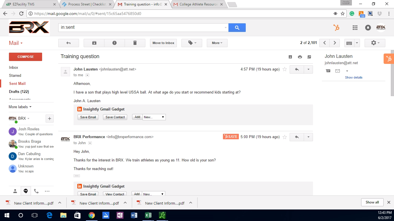 The example below will see an example of an email thread we received from an interested parent. You can also see if the thread that has questions about ages we start training this is a very common question we receive and we train as young as 11 years old but are very up front with people that this is not one on one training.