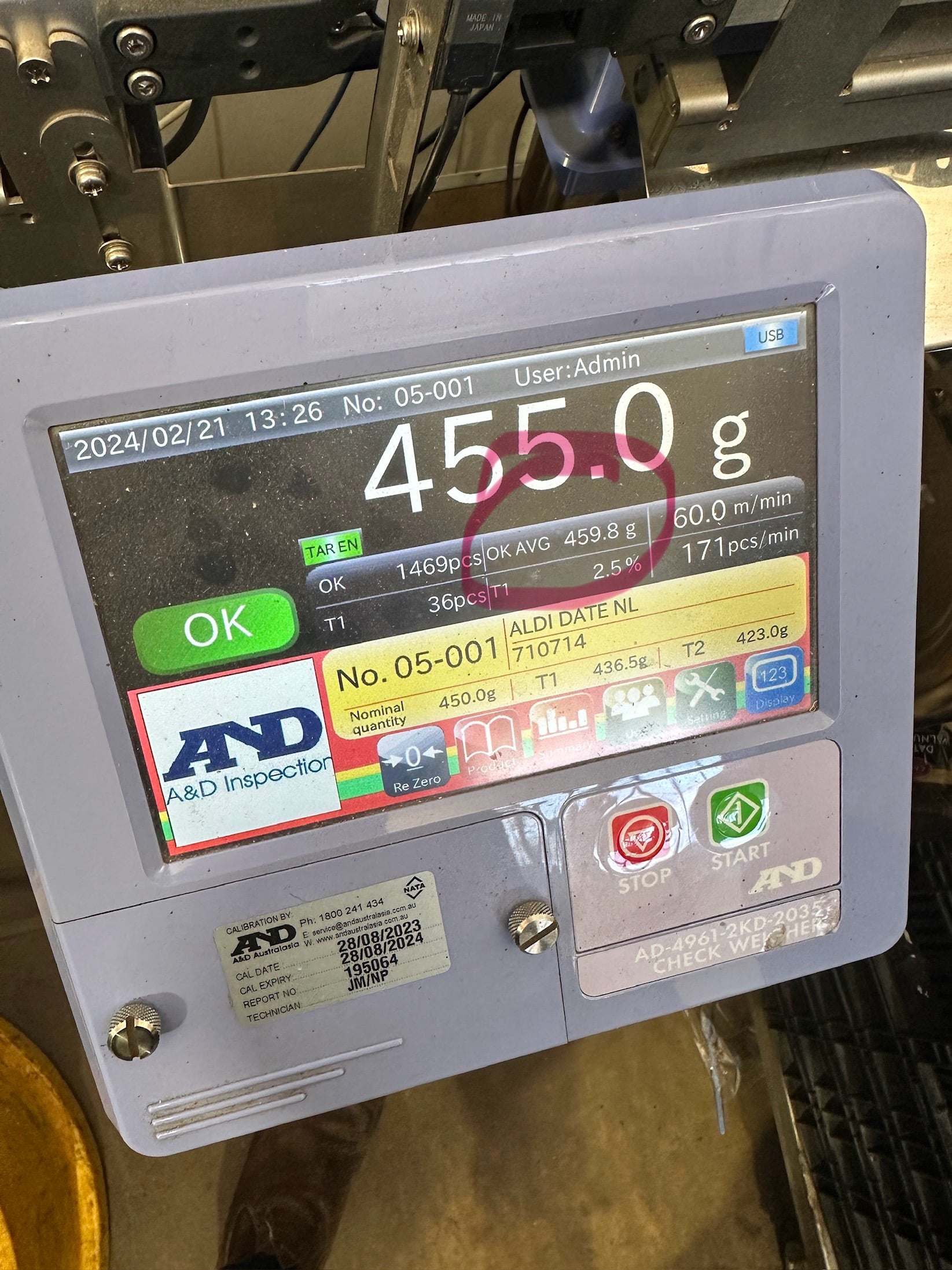This product has been flagged as AQS "E-Mark" and all products at the end of the run that have been marked as underweight can be put through the system again (you do not need to remove packaging). Simply pass through the metal detector again.