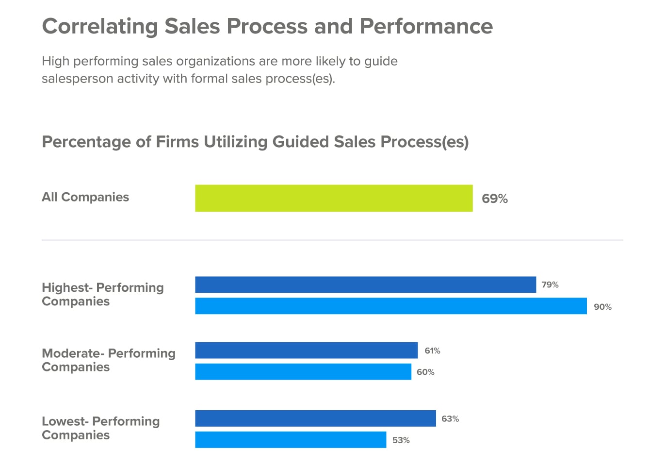 According to the Sales Management Association, 90% of the highest-performing companies use a formal, guided sales process. This is compelling, but hardly surprising, especially to those of you who have first-hand experience seeing the before and after of implementing a formal sales process.
